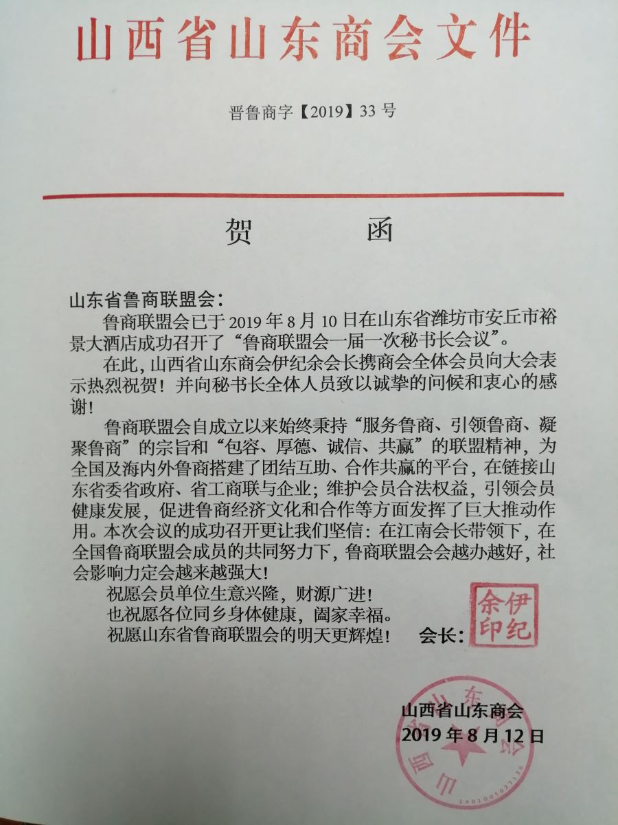 受山西省山东商会会长伊纪余、秘书长兼副会长刘小虎委托,副秘书长赵彪代表山西省山东商会参加此次会议。